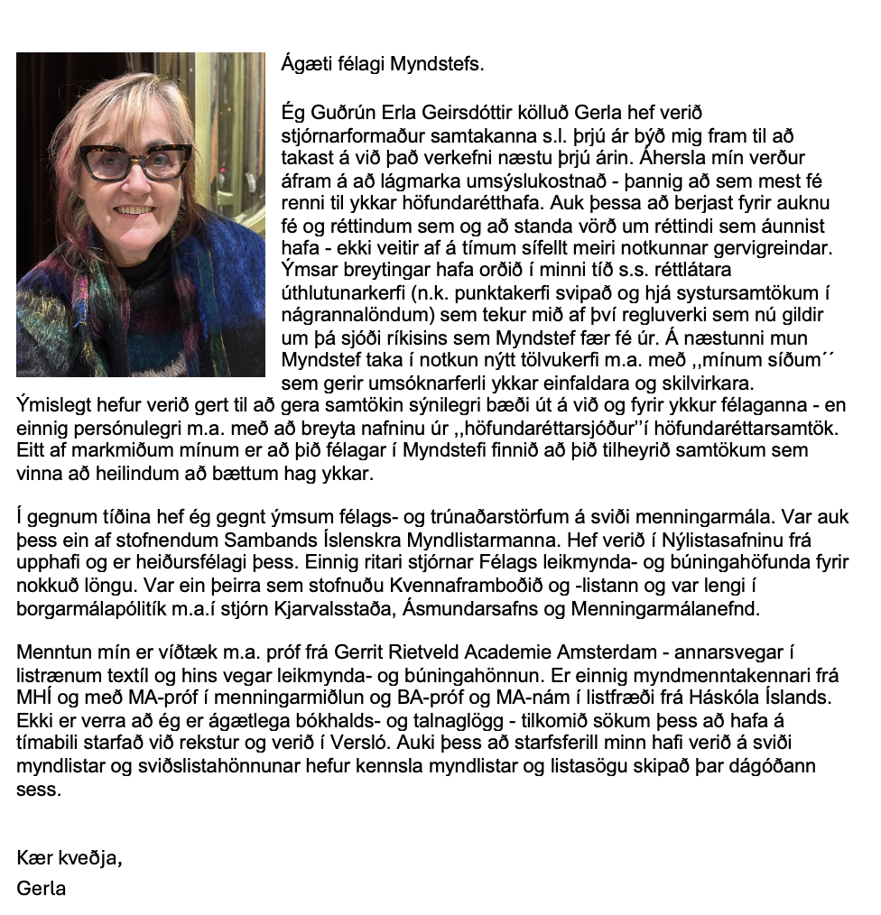 Eitt framboð barst til formanns stjórnar Myndstefs fyrir aðalfund 2026, en sitjandi formaður stjórnar gaf kost á sér til áframhaldandi stjórnarsetu.